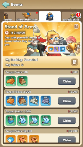 Similar to other point-accumulation events like Grow Your Heroes, Working Overtime, and Power Up, the Stand of Arms event uses a comparable reward system featuring two categories: milestone rewards and honor ranking rewards.