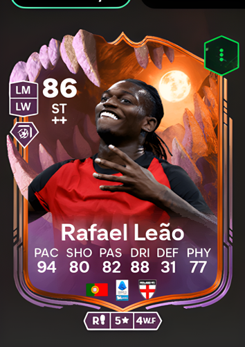 Rafael da Conceição Leão's Ultimate Scream card features him as a Striker with an impressive overall rating of 86, making him a standout option in any squad. Boasting a blistering pace of 94, exceptional dribbling at 88, and solid shooting and passing ratings of 80 and 82 respectively, Leão is built for rapid, incisive attacks. His physicality rating of 77 ensures he can hold his own against defenders, while his lower defensive stat of 31 emphasizes his attacking focus. As a forward, Leão's explosive speed and technical skills allow him to break through defensive lines with ease, creating goal-scoring opportunities and giving you the edge to secure victory in crucial matches.