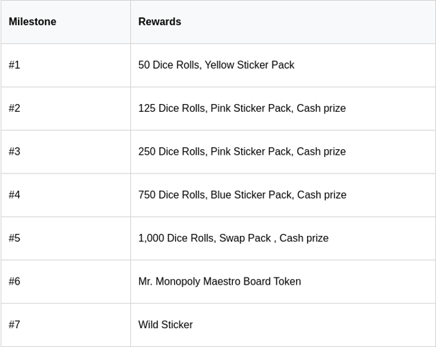 The latest Tycoon Pass in Monopoly GO offers a total of seven exciting milestones to reach. As you progress, you'll unlock a variety of rewards, including different types of dice, sticker packs of various rarities, and more. Achieving all milestone levels grants you special items like a swap pack and a wild sticker to enhance your gameplay experience.
