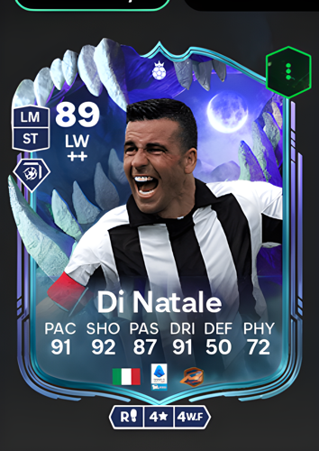 Antonio Di Natale's Ultimate Scream Hero card stands out as a dynamic Left Wing option with an impressive overall rating of 89, boasting remarkable individual attributes such as 91 pace, 92 shooting, 87 passing, and 91 dribbling. These elite ratings highlight Di Natale's ability to excel in fast-paced attacking scenarios, making him a sharp and agile threat down the flank. As a winger, his blistering speed and clinical finishing allow players to swiftly break through defensive lines, create scoring opportunities, and decisively impact the outcome of any match.